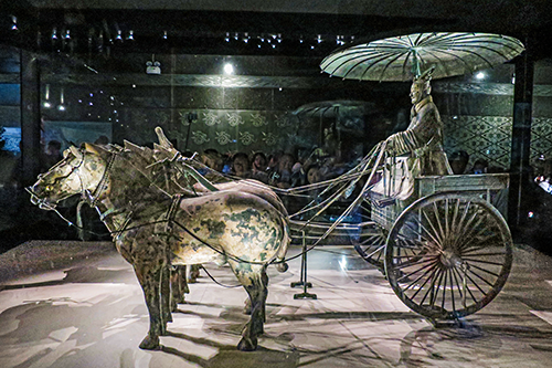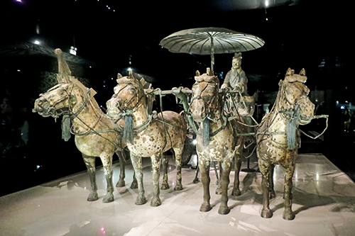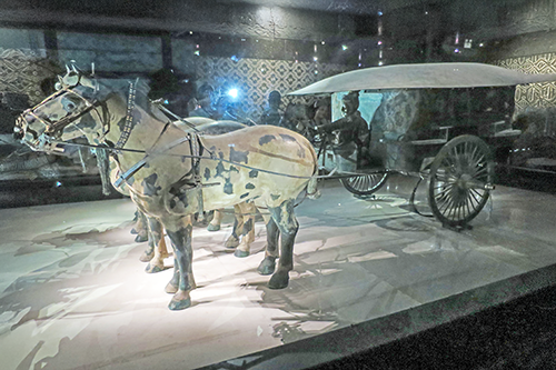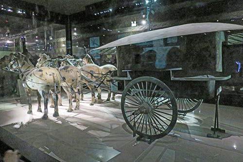 この馬車とこのページ最後の写真の馬車は秦始皇帝陵墓の西側、わずか数十メートルしか離れていない場所で発見された馬車の二分の一のレプリカ。