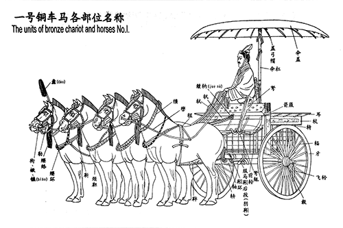 四頭立て馬車の近くに掲示されていた図を見ると「一号銅車馬各部位名称 The units of bronze chariot and horses No.1」とあり、これがブロンズ製だと分かる。