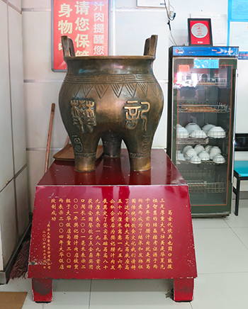 店の奥に据えられた鼎が載っている台の説明はこの鼎の説明ではなく、中華美食文化の源を説いたもので中程に『米と金、銅の器を用い、 大いなる食の道を成した。 腊月の間に調え、 気を炊き、器を整え、 味の根拠を確かにする』とある。
