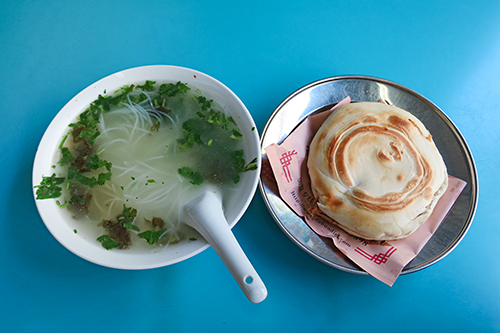 优質肉夾馍12元(210円)、粉絲湯3元(53円)、〆て15元(263円)。