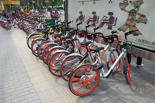 西大街の鐘楼ロータリー近く、真新しい自転車が並んでいるのはレンタル・サイクル・ステーション。この自転車に乗っている人を、西安市内のアチコチで見かける。