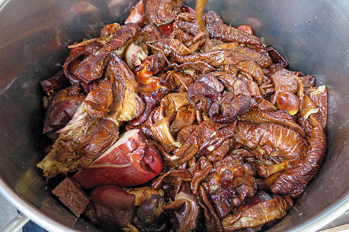 小さな店の片隅に直径40 - 50センチメートル位のステンレス製の大きなボールが置いてあり、中には艶々した燻製ホルモンが入っている。孫さんはアレヤコレヤ細かな注文をつけながら拳二つ分ほどの量を買う。