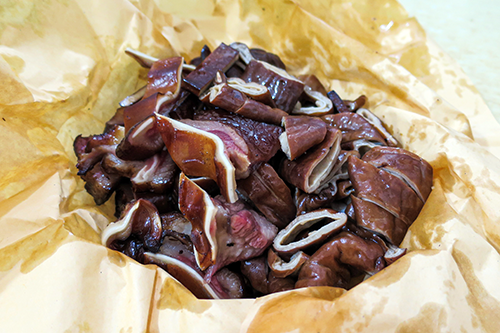粉汤は中国春雨スープ、羊血は字の如く羊の血を豆腐状にしたもの、梆梆肉は西安特産の豚ホルモンの燻製のことで、今日、孫さんがタバコ屋で買って旺軍烤肉虾尾や恵記に持ち込んだモツの燻製の仲間だ。