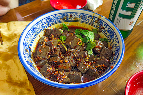 羊血豆腐は淡泊な味だがタレが旨かった。麻辣だけで無く旨みが濃くて豆腐を完食した後はタレをツマにビールが進む。