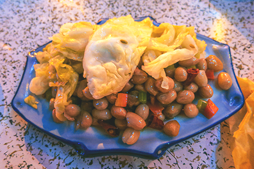 酸味が利いた豆とキャベツの西安の漬け物、キャベツがシャキシャキのこの一皿もビールによく合う。