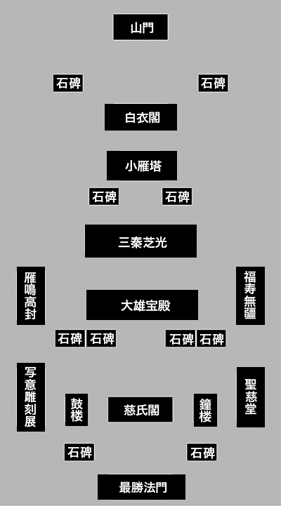 大雄宝殿の左側に並ぶようにして建っているのが雁鳴高封、右側に並ぶのが福寿無疆。