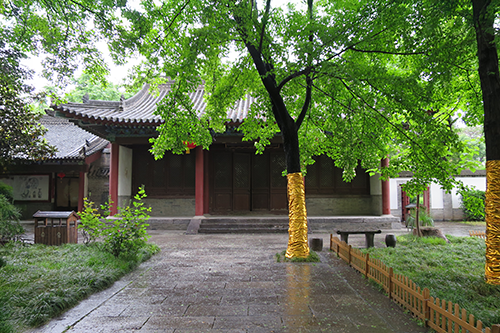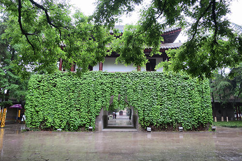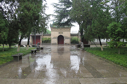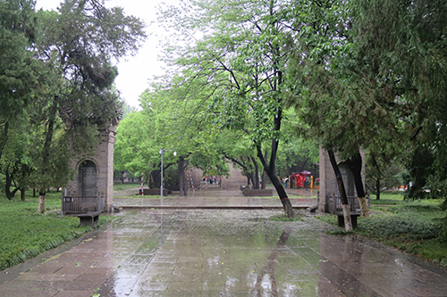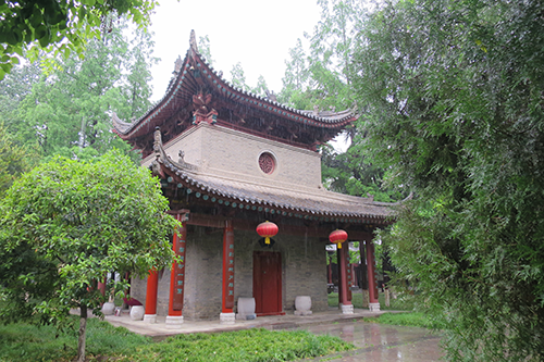 白衣閣の奥、二基の石碑塔の前で振り返ると木の間から小雁塔が頭をのぞかせている。