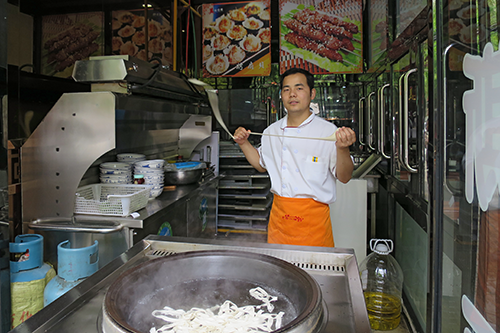 店の入り口では麺球を延しながら引きちぎって湯の入った大鍋に入れていた。