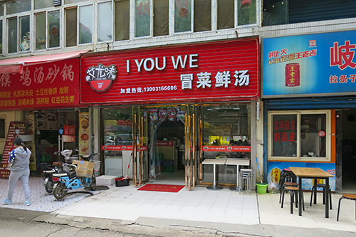 “I YOU WE” の看板はは何を意味しているかわからないが、その下にある「冒菜鮮湯」は「一人用火鍋」のような料理。こちらに来てから本場激辛の火鍋を試す機会は一度もなかった。