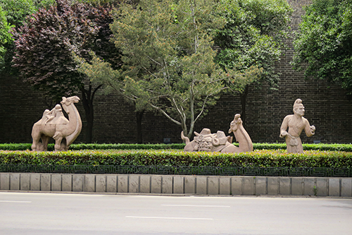 安定門を囲む植え込みでシルクロードを連想させるモニュメントを見つけた。この近くがシルクロードの出発点か、と思いモニュメントを説明する標示を探したが見つからなかった。