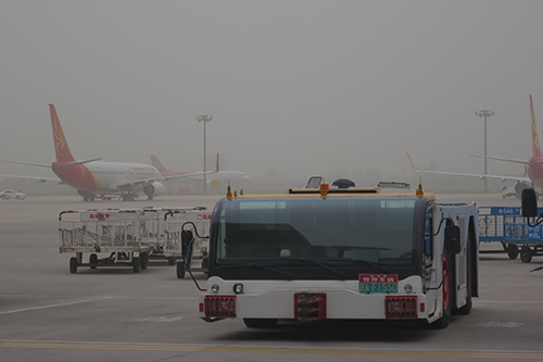 確かに駐機している機体の後ろは黄色く霞んで見えない。