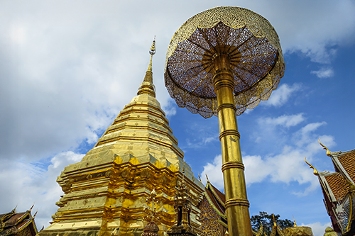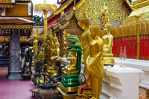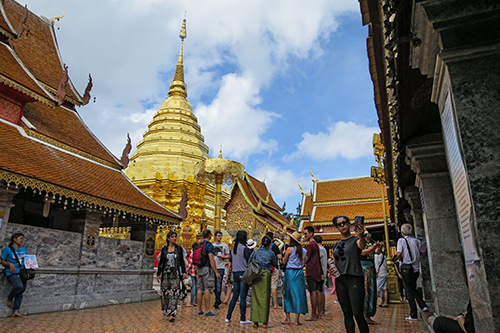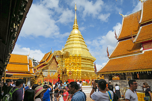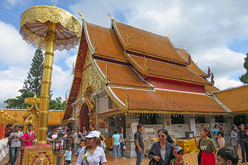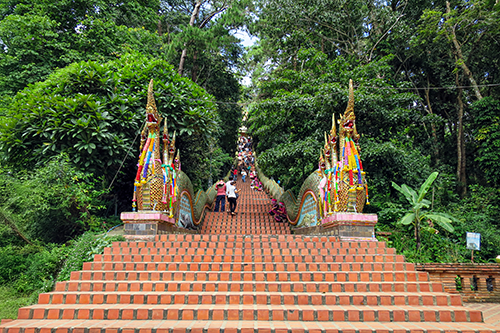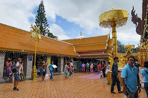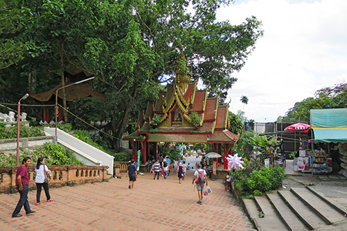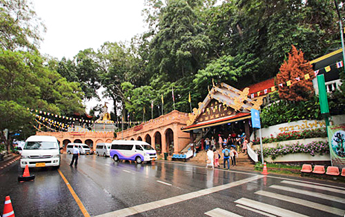 チェンマイ動物園の前を通って高さ1080メートルのステープ山(Doi Suthep)の曲がりくねった道を登ること40分余り、チェンマイ中心部からおよそ15キロメートル、赤煉瓦の回廊と三角屋根の門の前に出た。