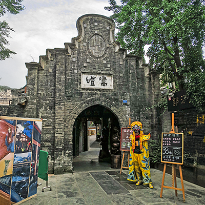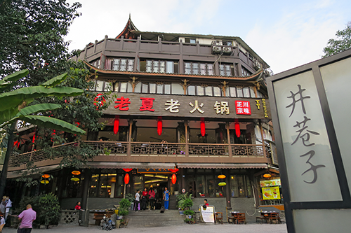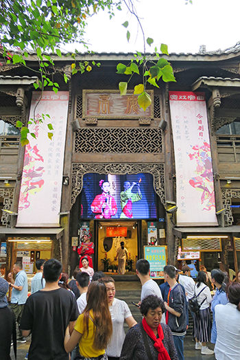 川劇(四川オペラ)や変面ショーを上演している劇場。屋根の下にかかる額は「魔高」あるいは「高魔」と読めるがこれが劇場の名前かは不明。