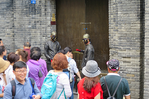 四合院風の建物の門の前で赤い扇を持った黒ずくめの若者が、大声で客寄せをしている。しばらく見ていたのだが彼らが何を商っているのかとうとう分からなかった。