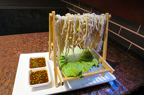 写真入りのメニューで麺だと思って晾杆千层肚を頼んだらホルモンのセンマイを細く切ったものだった。39元(¥741)。