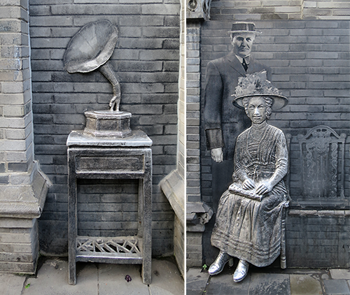 門の左にある蓄音機のレリーフは王氏とその夫人の思い出につながるものなのだろう。門の右には王氏とその夫人と思われる姿が記されている。