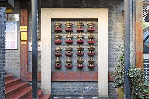 門の奥に火鍋を並べて飾ってある。ここは名の知れた火鍋屋だがもちろん食事をすることはなかった。