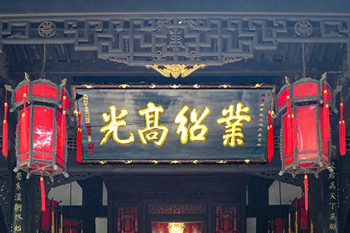 扁額の「業紹高光」は(劉備が)高祖(漢を開いた劉邦)や光武帝(後漢の初代皇帝である劉秀)の業を引き継いだ(紹)ことを表している。扁額の書は清の同治年間(1862 -- 1874)に成都将軍で四川の都督を務めた完顔崇石の手による。