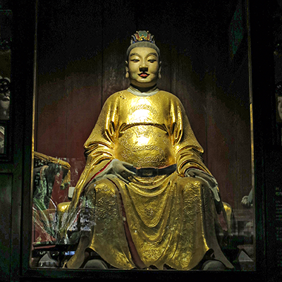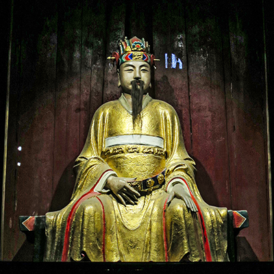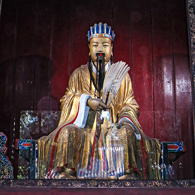 漢昭烈廟中央に祀られている劉備像は金色の衣装をまといユッタリ構えている。以下は像の説明版より。