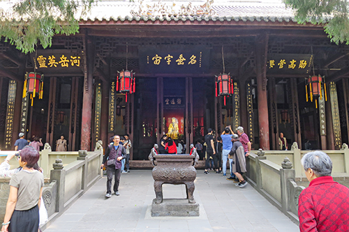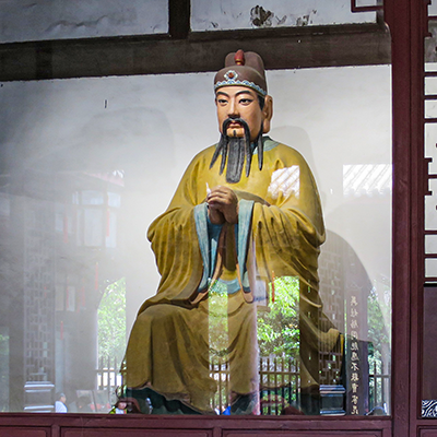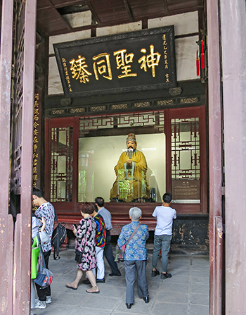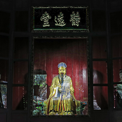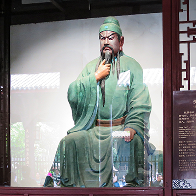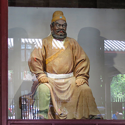武侯祠の正面、大きなガラス格子で仕切られた「静遠堂」の中から諸葛亮がこちらを見ている。