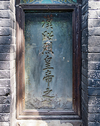 扁額の下を潜ると直ぐに灰白色の石積みでできた門があった。門の中央に「漢昭烈皇帝之?」の碑が嵌め込まれている。 最後の一文字は削られたようだ。