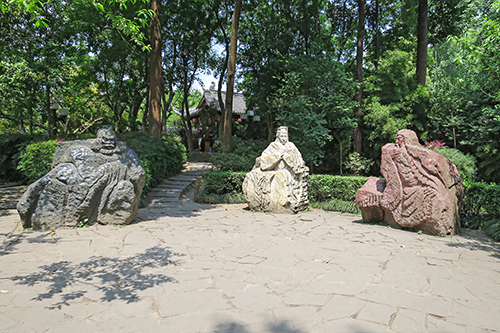 石碑の横にはズシリと量感のある石像が三体並んでいる。 もちろん劉備、関羽、張飛の三人だ。