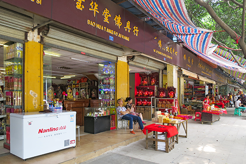 道の左側は広い歩道になっていて仏具屋が並んでいる。