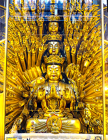 円通宝殿の中央はガラスケースに収まった四面の千手千眼観音像で、1008の 手と眼を持っている。