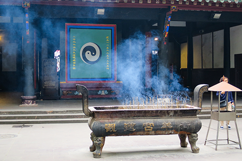 | 常香炉越しの霊祖殿と陽魚太極図。 |