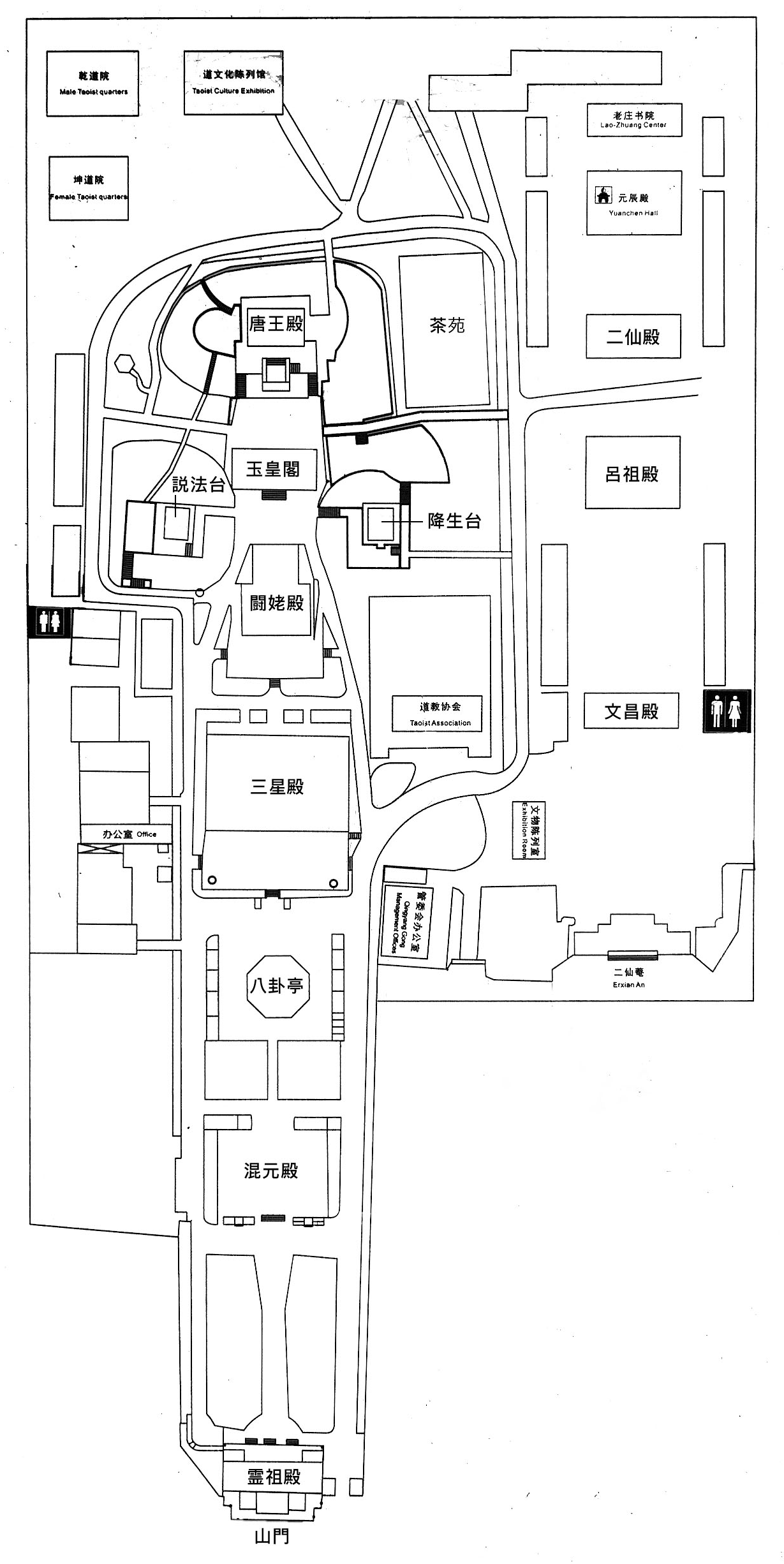 唐代に建立されたが、明代に焼失し、清代に再建されたのが今の姿で、主要建築物は南北一線上に並んでいる霊祖殿、混元殿、八卦亭、三清殿、闘姥閣、説法台、降生台、玉皇閣、唐王殿などがある。