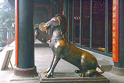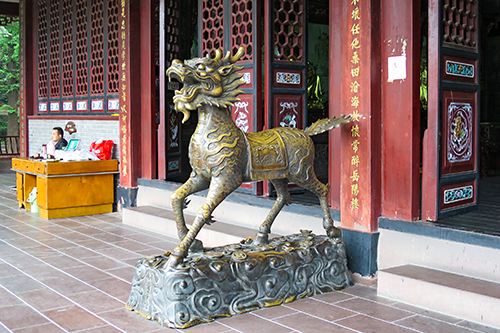 右側の一角羊は、清朝雍正時代に張鵬羽が北京から移設したもので、十二支の動物の特徴、つまり耳は鼠、鼻は牛、爪は虎、背は兎、角は龍、尾は蛇、口は馬、ヒゲは羊、首は猿、眼は鶏、腹は犬、尻は猪だと言われている。