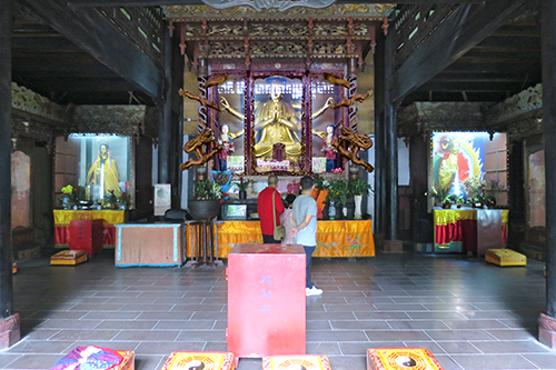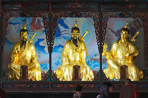 殿内には上清霊宝天尊(左)、玉清元始天尊(中央)、太清道徳天尊(右)の三清(道教の神様)の聖像が祀られている。