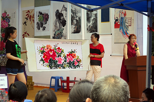 声に引き寄せられ覗いて見ると、特設ステージ上で工芸画のオークションをやっていた。100元とか200元の声はオークションを司会するオークショニアの声だった。