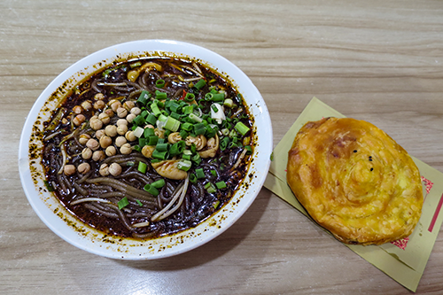 肥腸粉(12元/¥228)と鍋魁(6元/¥114)を注文。やはり辛い醤を入れるかどうか聞かれたが、当然入れてもらう。