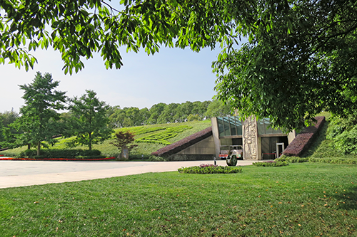 緑の芝にすっぽりと覆われた、古墳のような趣の綜合館から。