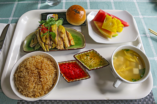上品に盛られた料理は海難鶏飯、鶏スープとデザート付き。
