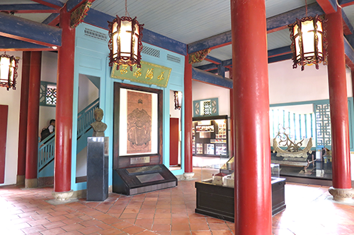 鄭成功の肖像画の上に掛かる扁額「東海流霞」は、鄭成功の五言誌「礼楽衣冠第、文章孔孟家、南山開寿域、東海醸流霞」からとったもの。