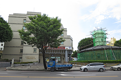 ぶつかる際の右角が現在補修中の正十八角形の建物と、その中心から白い塔が伸びている旧台南測候所。その姿から「胡椒管」とも呼ばれる。