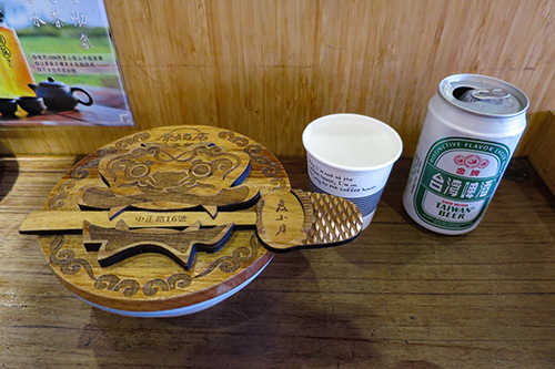 | 珍しい蓋付きの担仔麺と台湾麦酒。 |
