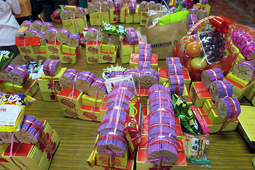 | 供物台に積まれた冥銭(紙銭)。 |