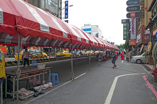 湯徳章紀念公園のロータリーから中山路に入ると台南車站に向かう車線が全て規制され、赤白の幔幕テントが道を覆っている。