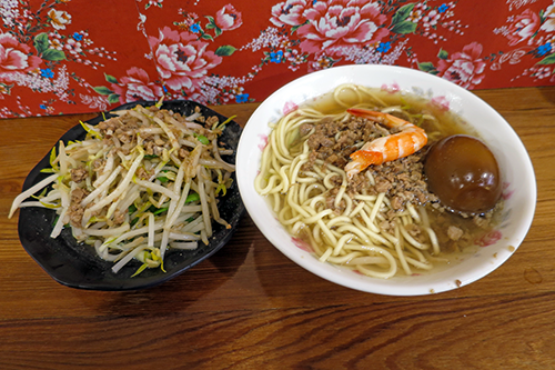 | モヤシ肉味噌と煮玉子を追加した擔仔麺。 |