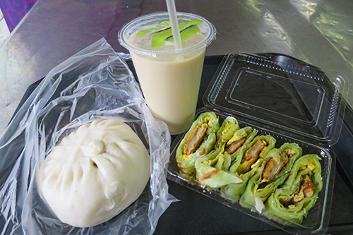 公園路にぶつかる角に紫色を基調にした看板の食堂があったのでここで朝食にする。台北の豆乳屋なのか台北永和豆漿という店の名だ。