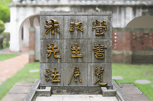 門を入って直ぐの左手に金の浮き彫りで『朱玖瑩先生書法展覧』と書かれた碑が建っている。