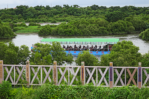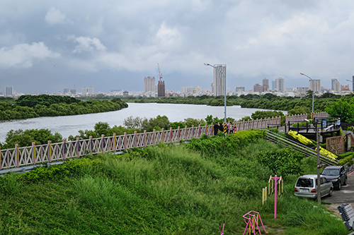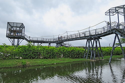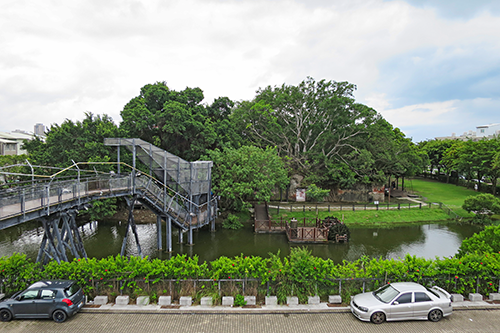 安平樹屋の裏から池を越えて鹽水渓(市内を流れる河川)を望む展望台への橋が掛かっている。