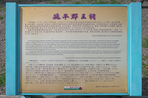 永暦16(1662)年に安平でその生涯を閉じた鄭成功の事績と人柄をたたえるために、同年、彼を慕う人達によって「開台聖王廟」として建立され、その後の社会情勢の影響を受けてその名も開山王廟、明延平郡王祠、開山神社、そして再び延平郡王祠と変遷している。