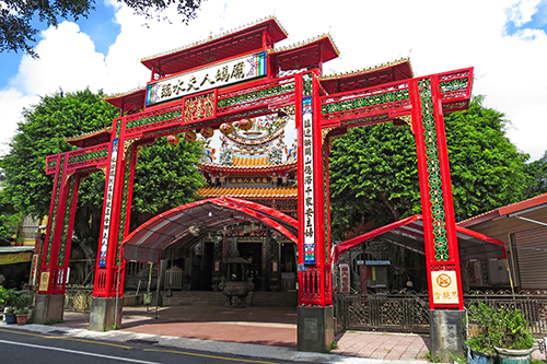 延平郡王祠の正殿裏を通る建業街を挟んで延平郡王祠の真向かいに建つ真っ赤な門が臨水天人媽廟の碑坊。