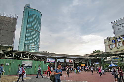 駅の改札を出て振り返ると見える円筒形の高い建物は、台南車站東口駅前に立つ香格里拉台南遠東大飯店(シャングリ・ラ・ファー・イースタン・プラザ・ホテル台南)。